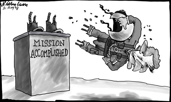 Otsikko viittaa Bushin lentotukialuksen kannella pitämään kuuluisaan puheeseen toukokuussa 2003. GWB ilmoitti tuolloin Irakin sodan päättyneen Yhdysvaltain ja sen liittolaisten kunniakkaaseen voittoon. Alukselle levitetyssä julisteessa luki ”Mission Accomplished” eli tehtävä suoritettu. Tuon päivän jälkeen Irakin sodan takia on kuollut välittömästi tai välillisesti satoja tuhansia ihmisiä. Eräiden arvioiden mukaan kuolonuhrien määrä on jopa miljoona. Joukossa on mukana USA:n armeijan ja koalition yli 4 000 kaatunutta sotilasta.
